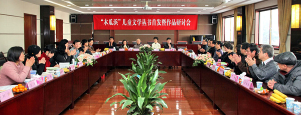 研讨会上,杭颖首先致辞,对此次研讨会的举行表示祝贺,对各位专家、老师的到来表示欢迎,同时,回顾了昆山文学事业的发展历程,充分肯定昆山市儿童文学创作所取得的成绩,希望三位作者戒骄戒躁,创作出更多富有思想性、艺术性和时代性的好作品。朱建华代表苏州市文联,对此次研讨会的召开表示祝贺,作为江苏儿童文学的重镇,昆山在儿童文学创作上确实成绩喜人,希望三位作者继续保持创作热情,不断提高自身素养,为苏州的儿童文学事业作贡献。丛书的责任编辑、少儿社文学室主任谢倩霓宣读了《浅论“木瓜浜”作家群创作的共性和个性》的评论文章,系统分析了三位作者的创作特点和存在的不足;《少年文艺》编辑单德昌介绍了昆山历年来在《少年文艺》发表的作品的数量和质量,对当下昆山的儿童文学创作予以充分肯定;《中国儿童文学》编辑梁燕以《告诉你这样的水乡》为题,提出写“乡土小说”要在语言上作进一步开拓,让作品“更具厚重更有回味的空间”;专家组老师周基亭、朱效文、范培松、刘绪源、梅子涵等分别就昆山儿童文学的发展、三位作者的作品特色作了分析,就作品本身提出自己的看法。儿童文学作家金曾豪、王一梅、韩青辰、殷健灵、萧萍等与会,并先后发言,从一个创作者角度对三位作者的作品进行了探讨,希望三位作者在保持原来风格的同时,更要注重民间性,进一步研究儿童心理和挖掘人性。三位作者在会上也作了交流,畅谈了各自的创作经历和体会。