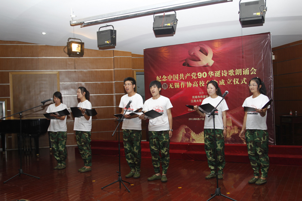 6月27日下午,由无锡市作协、江南大学人文学院主办的“纪念中国共产党90华诞诗歌朗诵会”在江南大学举行,省作家协会副主席、无锡市作协主席陆永基等领导和学院师生共300多人观看了朗诵会。朗诵会上,学生们精选了16首雄浑壮美、荡气回肠的诗篇,唱响了青年学子们的阳光礼赞,抒发他们热爱党、讴歌党的壮丽情怀。一腔腔矢志不渝的红色情怀,从这里喷薄而出;一首首慷慨激昂的山河吟诵,在这里激情舒展。这些诗篇中既有《祖国啊,我亲爱的祖国》、《回延安》、《沁园春-长沙》等经典篇章,又有学生们原创的《颂歌》、《走进西部》等诗作,歌颂了90年来我们党走过血雨腥风,越过激流险滩,引领中华民族走向富强的光辉岁月,青年学生们也用这样的方式抒发了他们热爱党、跟党走的青春信念。