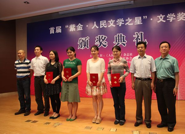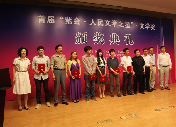 “紫金·人民文学之星”文学奖是在江苏省委宣传部的大力支持下,由《人民文学》杂志社和江苏省作家协会联合创办,设立这个奖项的目的,是为了繁荣我国的文学创作、推动文学事业的发展,挖掘培养文坛最新的生力军,这个奖项是专门针对30岁以下年轻作家所设立的全国性文学大奖。首届所评选的作品范围包括:2012年1月—2013年6月年在《人民文学》杂志等国内文学期刊、报纸与出版社发表或出版的作品,经过评审专家提名推荐、初评、复评、终评共评出6名获奖作者和13名提名奖获得者,长篇小说奖和非虚构文学奖空缺。