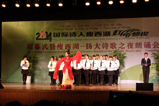 4日,2014国际诗人瘦西湖虹桥修禊闭幕式暨瘦西湖—扬大诗歌之夜朗诵会在扬州大学礼堂举行,王小妮、管管、臧棣、阿莱什•施蒂格、菲欧娜•桑普森、夸梅•道斯、陈东东等国内诗人和国际诗人吟诵了各自的代表作,扬大师生也表演了精彩的诗歌节目。其间,扬州大学聘请著名诗评家唐晓渡、著名华语诗人杨炼为兼职教授,希望他们通过诗歌给扬大的师生带来智慧和欢愉。