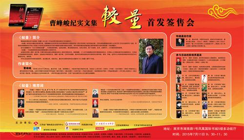 凤凰网江苏站南京讯,7月11日上午9:30,南京凤凰国际书城、江苏广播电视总台报刊中心、江苏省作家协会创作室、江苏省朗诵协会、新华网江苏频道、凤凰网江苏站、江苏圣典律师事务所在湖南路凤凰国际书城联合举行由光明日报出版社出版的曹峰峻纪实文集《较量》首发签售会。