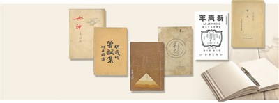 图为见证中国新诗诞生的《新青年》以及胡适(《尝试集》)、郭沫若(《女神》)、冰心(《繁星》)、康白情(《草儿》)、徐志摩(《志摩的诗》)等诗人的早期新诗集。