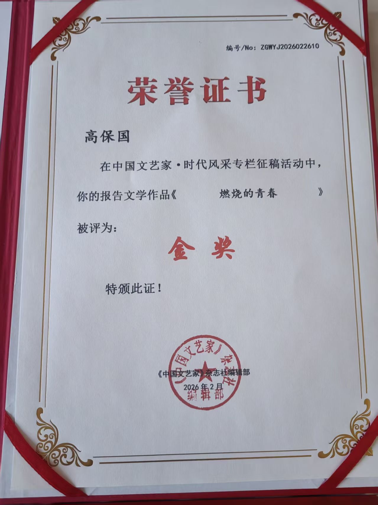 高保国长篇报告文学《燃烧的青春》崭获“时代风采”征文比赛金奖