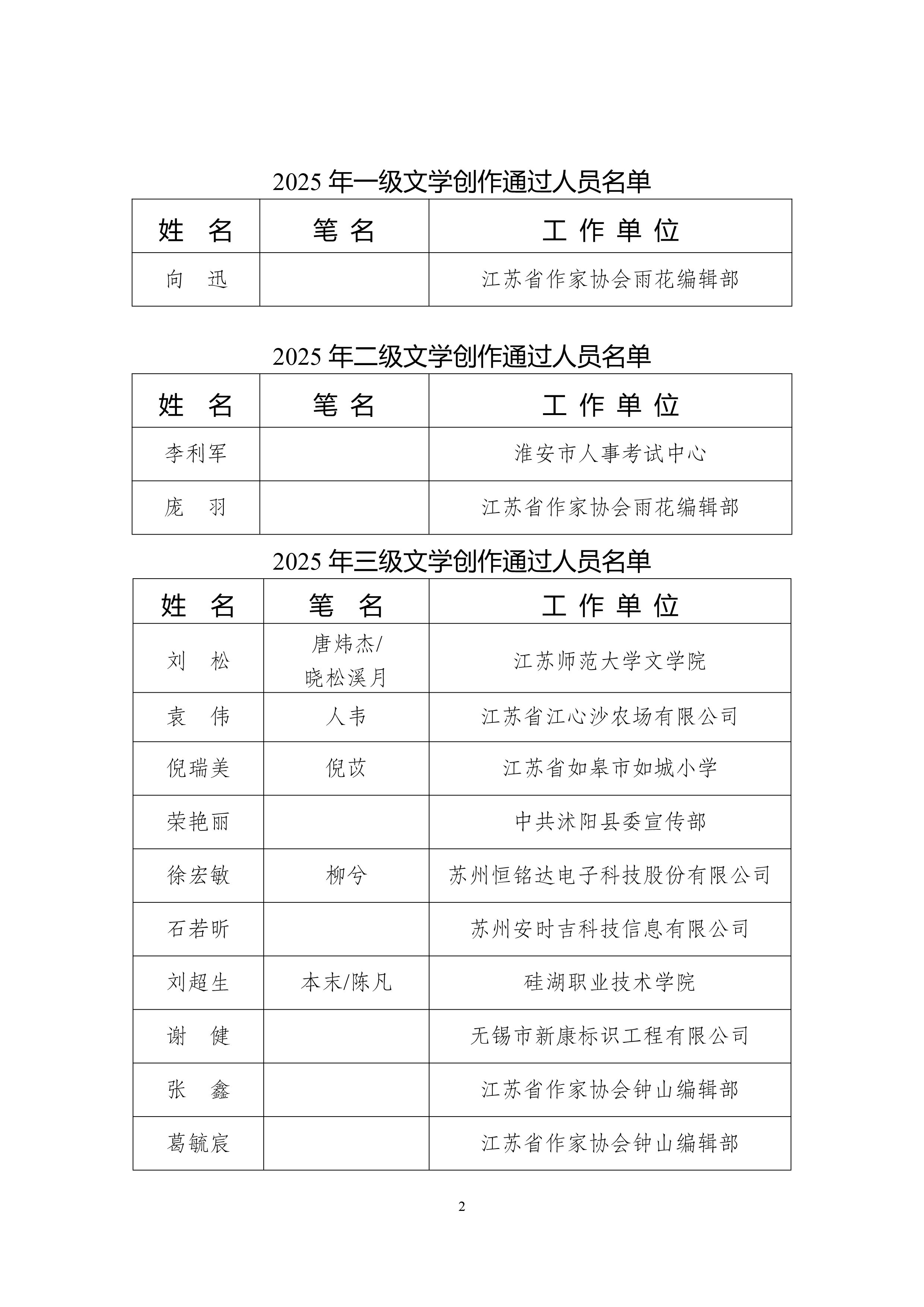 江苏省文学创作专业高级专业技术资格评审委员会于2025年11月25日在南京召开评审会议,向迅1人通过一级文学创作专业资格认定;李利军等2人通过二级文学创作专业资格认定;刘松等10人通过三级文学创作专业资格认定。根据江苏省职称评审程序规定,现予以公示。