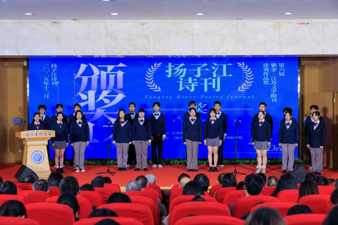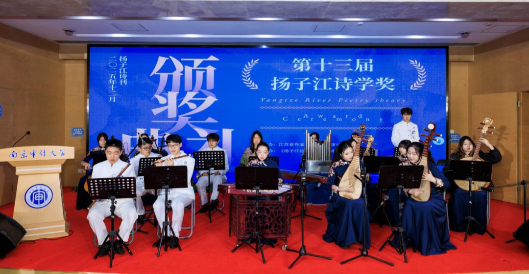2025年12月8日晚,第六届紫金·江苏文学期刊优秀作品奖《扬子江诗刊》奖、第十三届扬子江诗学奖颁奖仪式在南京审计大学浦口校区隆重举行。中国作家协会诗歌委员会主任、中国作协原副主席吉狄马加,江苏省作协党组书记、书记处第一书记、副主席郑焱,南京审计大学党委书记董必荣,省作协党组成员、书记处书记、副主席,《钟山》杂志主编贾梦玮,南京审计大学党委常委、副校长周方舒,省作协副主席,江苏文艺评论家协会名誉主席,中国作协文学理论批评委员会副主任汪政,省作协副主席、《扬子江诗刊》主编胡弦,南京审计大学国际学院党委书记张晋津、国际学院党委副书记王静,及校宣传部、团委、图书馆、国际学院、文学院的领导师生,与获奖诗人、特邀嘉宾齐聚一堂,共同参与本次颁奖仪式。