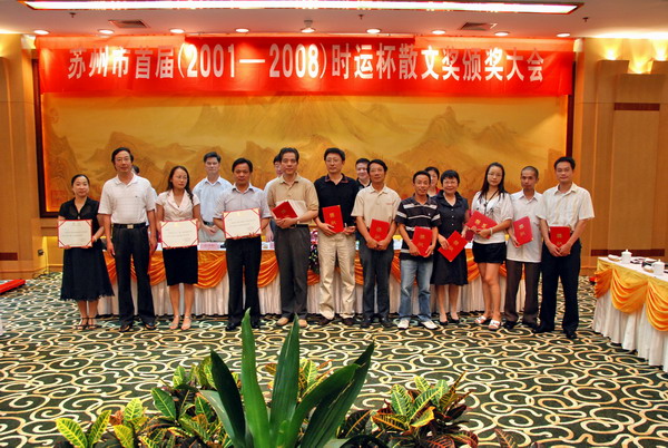 自今年起,市作协散文分会与苏州工业园区时运精工有限公司每两年共同举办一次“‘时运杯’苏州散文奖”活动。颁奖仪式上,苏州市文联党组书记、副主席朱建华向时运精工有限公司总经理陈大厦颁发了“特别贡献奖”。