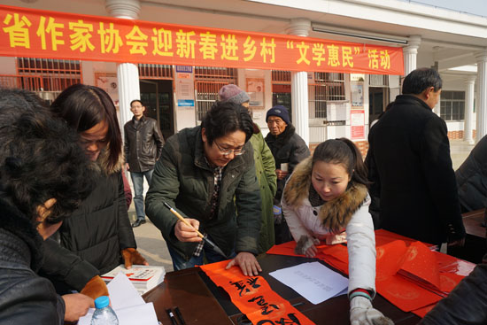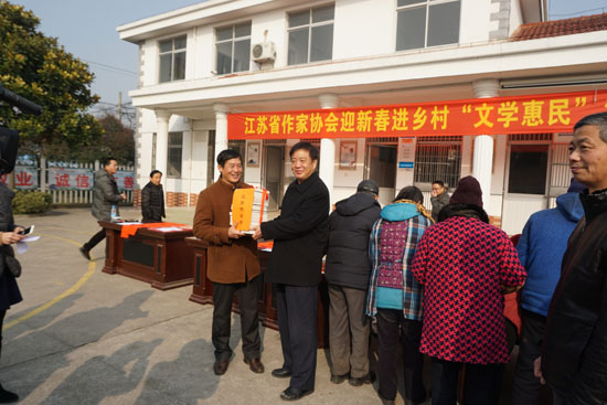 作家们还来到海门工业园区瑞北村和常乐镇“农家书屋”,赠送图书,并现场挥毫为村民们题写春联。