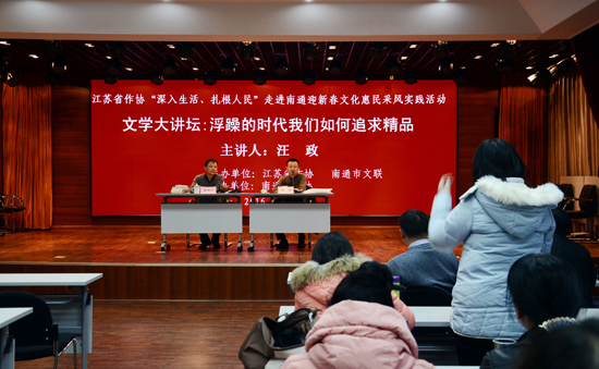 13日下午,汪政在南通文艺家之家主讲文学大讲堂,题为“浮躁的时代我们如何追求精品”,拉开了文学惠民活动的序幕。全市100多名文学爱好者聆听了汪政精彩精辟的演讲。作为从南通走出去的著名评论家,他多年来一直关注南通的作家和文学创作,在讲座中以诙谐语言与南通的作家进行了互动和交流。他深入地分析了当下文学创作的浮躁表现和原因,告诫南通的文学创作者一定要克服浮躁,不要一味追求发表,被时尚流行挟裹,要静下心来阅读经典。就如何打造正面的优秀作品,汪政提出一要重视题材的选择,“写什么永远比怎么写重要”,如南通刘剑波的《姥娘》《消失》这两部作品既是江苏、也是全国的精品,题材就抓得很好;二要重视艺术构思,一部好的文学作品,其内在的技术含量一定很高;三要重视自己的语言,要找准自己的类型、风格,把自己选择的一种语言做到极致,写出自己的个性。