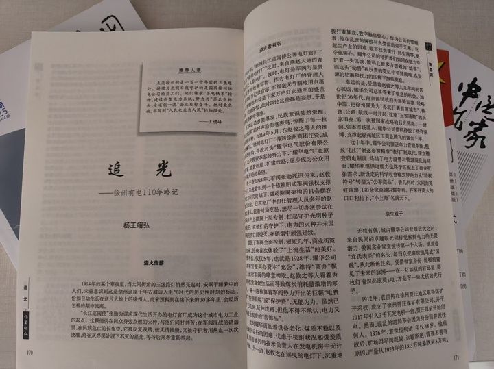 小伙叫杨王翊弘,出生于2000年,在沛县供电公司工作三年多。去年底,他的《追光——徐州有电110年略记》登上《中国作家》,一下子成了江苏电力系统的“名人”。省电力作协主席王啸峰把这条喜讯汇报给中国作协副主席、江苏省作协主席毕飞宇,毕主席听了啧啧称叹,连说要加小伙的微信。