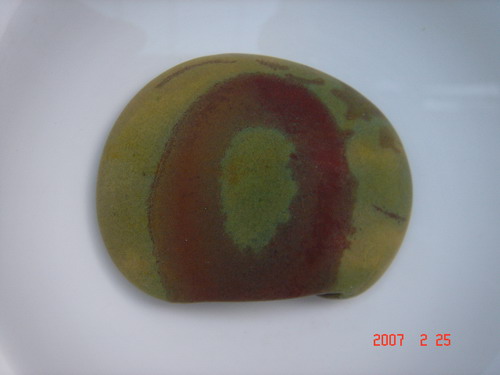 此石为玉髓石,触手光洁华润,青黄打底,正反面有赭色环各一。正面环中呈像,正看为一俊朗男生头部侧影,倒看为一耄耋富翁,侧看则为一肥豕。豕,即猪之古称,古人造字,豕为家的一部分,示室内有养方为家,且我国民俗,豕历来被奉为“富”与“福”的象征,民间储钱罐多做成猪形,即此意也。反面环中呈像,为一女子头部后影,连赭色环看,又为另一女子头脸正面像,二女相叠,实为金屋藏娇。倒看,环内是一金坛子,自然就是财富的象征。最妙的是二赭色环,两面分开看时,各是一个“0”,从正至反翻转看时,则连成一个“8”。