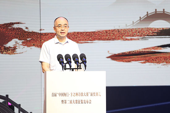 在颁奖典礼上,中国诗歌学会副会长、江苏省作协副主席、《扬子江诗刊》主编胡弦发布第二届大赛征稿启事,宣布第二届征稿自7月10日开始,到今年10月31日截止。吴义勤,汪兴国,沈雷,中国作协文学理论批评委员会副主任、江苏省作协副主席汪政,海门区委书记郭晓敏,南通市委宣传部常务副部长蔡忠,海门区人大常委会主任成伟,区政协主席、党组书记黄卫锋共同启动第二届大赛。