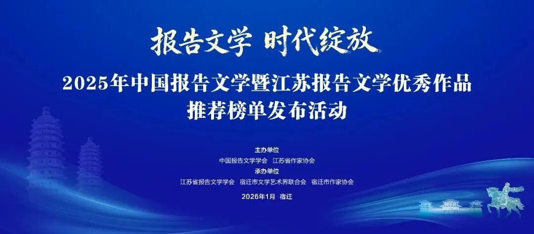 2026年1月26日上午,“报告文学 时代绽放——2025年中国报告文学暨江苏报告文学优秀作品推荐榜单发布活动”在宿迁举行。活动由中国报告文学学会主办,江苏省报告文学学会、宿迁市文学艺术界联合会、宿迁市作家协会联合承办。