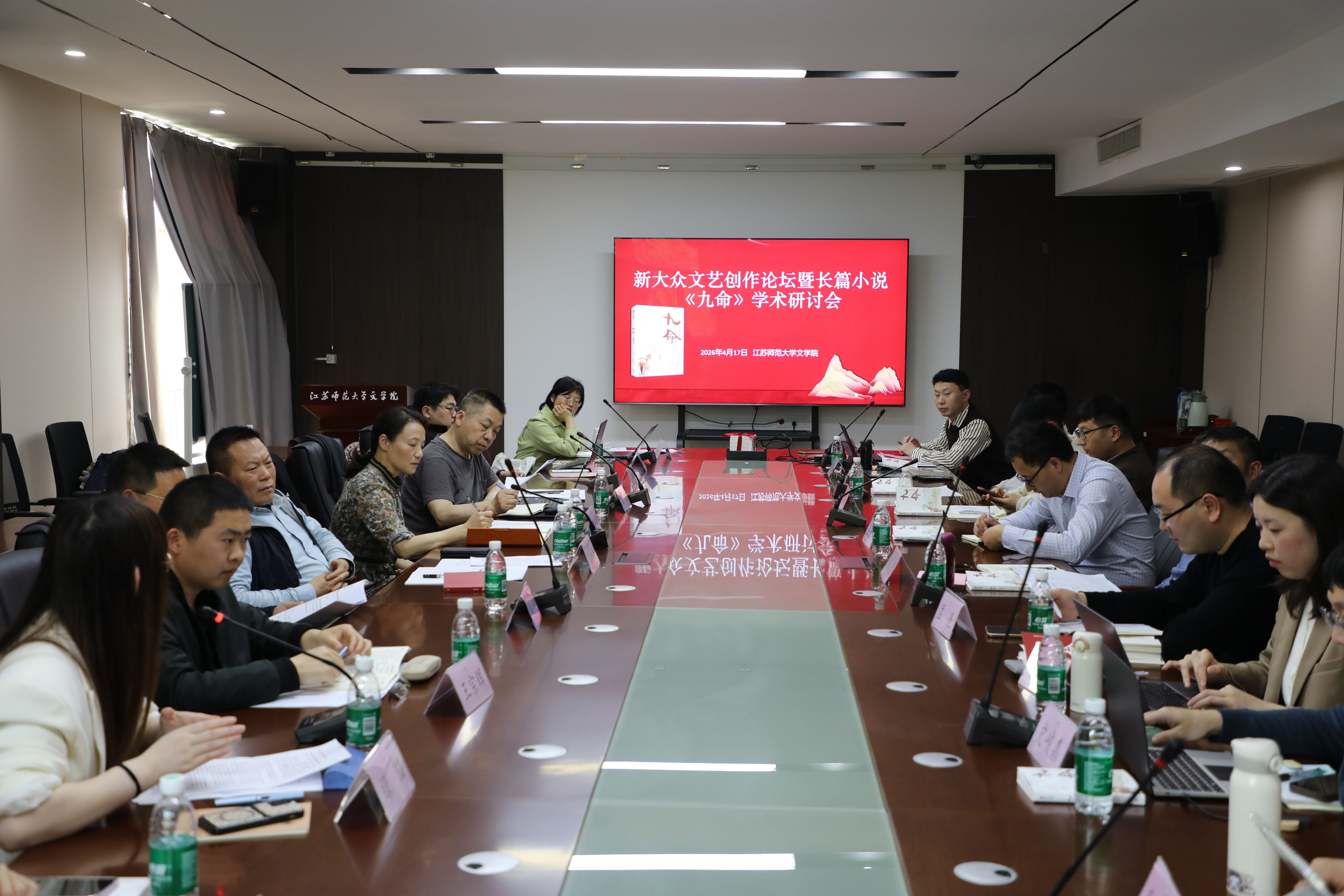 本场研讨结束后,举行了新大众文艺创作论坛暨长篇小说《九命》学术研讨会。会议聚焦新大众文艺与新时代青年写作的态势、困境与突破,青年写作的叙事结构与空间诗学,写作中的“故乡”想象,以及如何为小人物立传等前沿议题展开讨论。研讨会分别由江苏师范大学文学院副院长温德朝、副教授蔡茂主持,中国作协网络文学研究院研究员马季、江苏省产业教授吴长青担任评议人,徐州市作协秘书长吴彦婕、上海大学教授石娟等二十余位专家学者先后发言,围绕新大众文艺的学术内涵与美学特质展开热烈讨论,一致认为新大众文艺作为当下文学创作的重要现象,需要在商业逻辑与艺术规律、大众趣味与精神高度之间找到平衡,构建适配其发展的评论体系与研究范式。《九命》是江苏师范大学文学院教师、青年作家刘松(笔名唐炜杰)的最新长篇历史小说。小说以西周末年为背景,讲述了深山小村梁邑中二十名青年被选为勇士出山购盐的故事,在阶层森严的社会秩序中,有人执意攀爬“九命之阶”,有人则将磨难视为对内心坚守的考验,展现了小人物在历史变局中的挣扎、抉择与坚守。马季从网络文学与大众文艺的关系出发,分析了《九命》在历史叙事与大众阅读之间的平衡艺术。温德朝从叙事结构角度切入,认为小说在历史考据和文学想象之间找到了独特的叙事路径。与会专家普遍认为,《九命》以“为小人物立传”的叙事立场,为中国历史小说的创作提供了新的可能性。