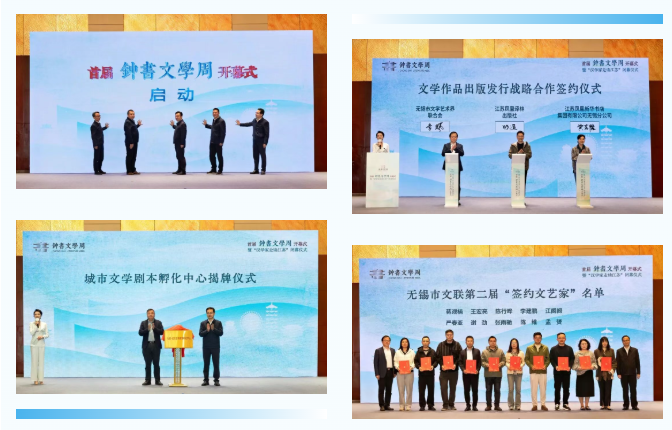 活动现场亮点纷呈,译林出版社、无锡市文联、无锡市新华书店举行三方出版战略合作签约仪式;无锡城市文学剧本孵化中心正式揭牌,打通文学IP与影视文旅转化通道;无锡市第二届签约文艺家名单公布并颁发聘书,为本土文艺注入青年力量。随后,郑焱、李强、封晓春、马剑、娄子丹共同上台启动首届“钟书文学周”。