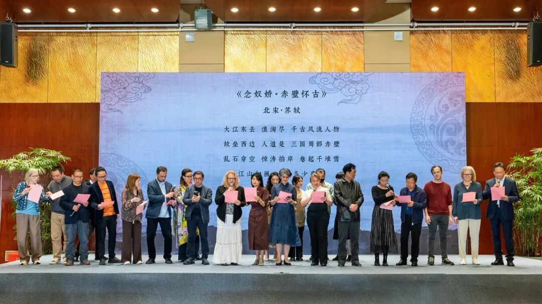 随后,“声音的河流”多语朗读会温情上演。本次朗诵会精心设置四大板块,由汉学家和特邀作家、本土作家、青年作家联袂组合登场,他们用汉语、英语、西班牙语、德语、波斯语等多种语言,以及苏州话、南京话、无锡话、宜兴话等地方方言,诵读杜牧、白居易、杨绛、汪曾祺等人的经典作品,多元声韵交织成文学长河,跨越语言阻隔,传递文学的丰饶与光华,中华文化在多种语言的交响里汹涌奔腾,走向世界。朗诵会尾声,中外20余位嘉宾携手同台,用汉语齐诵《念奴娇·赤壁怀古》《水调歌头·明月几时有》,气势恢宏、场面震撼,“但愿人长久,千里共婵娟”将文学之美与中外交流的深厚情谊推向高潮。