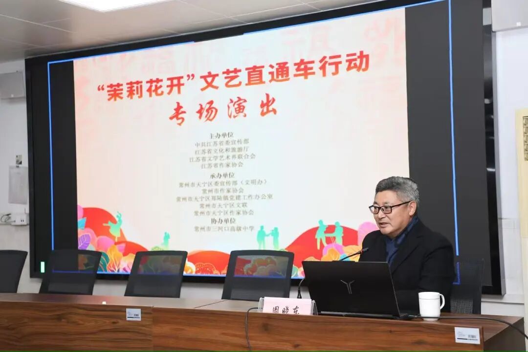 2025年12月17日,由江苏省委宣传部号召、江苏省作协组织的“茉莉花开”文艺直通车活动走进常州市三河口高级中学,天宁区作协牵头邀请常州市吴文化研究会会长、本土作家,一位特殊的文化点灯人周晓东,带来题为《苏东坡—一个千年不朽的有趣灵魂》的文学讲座。