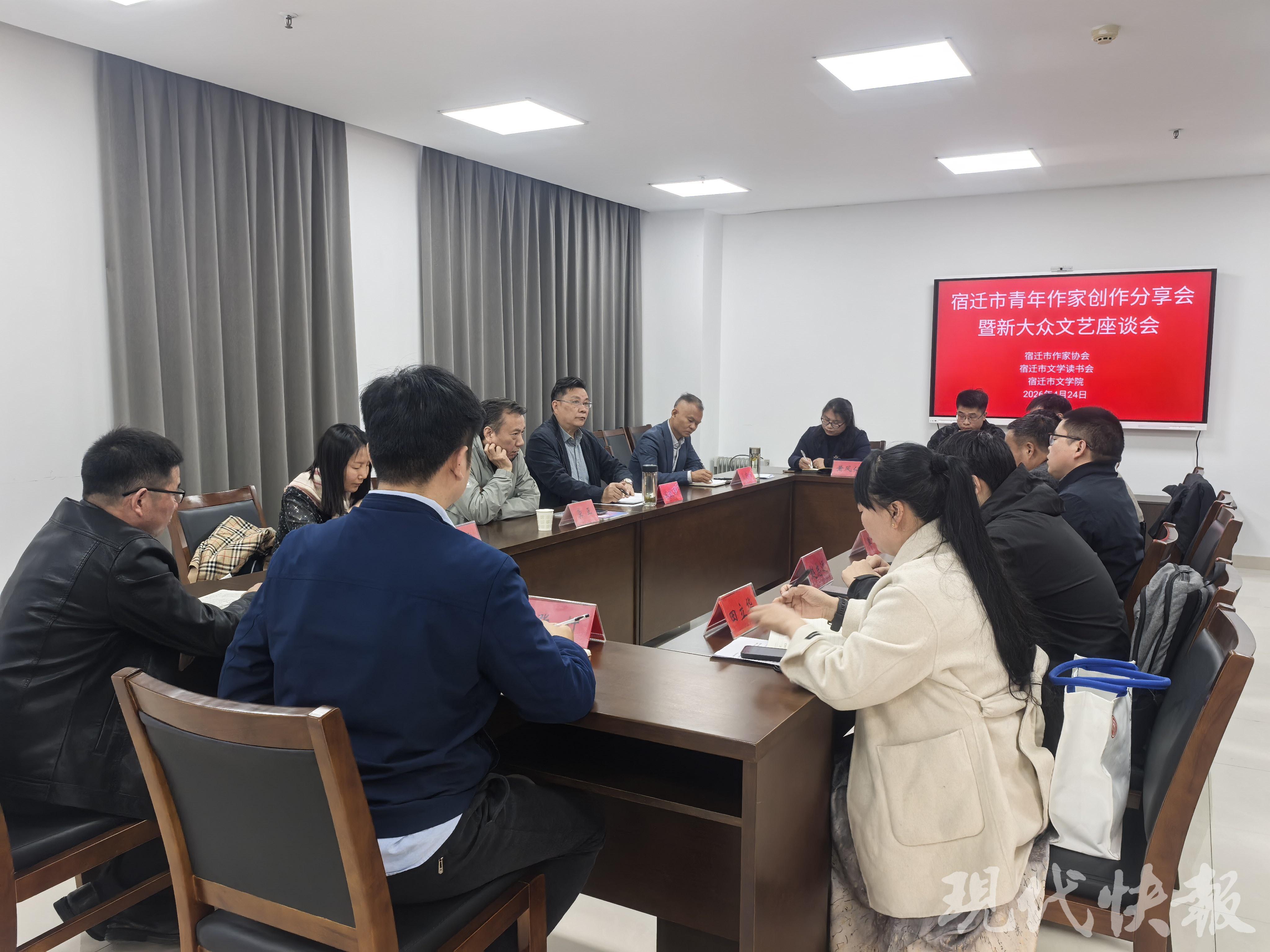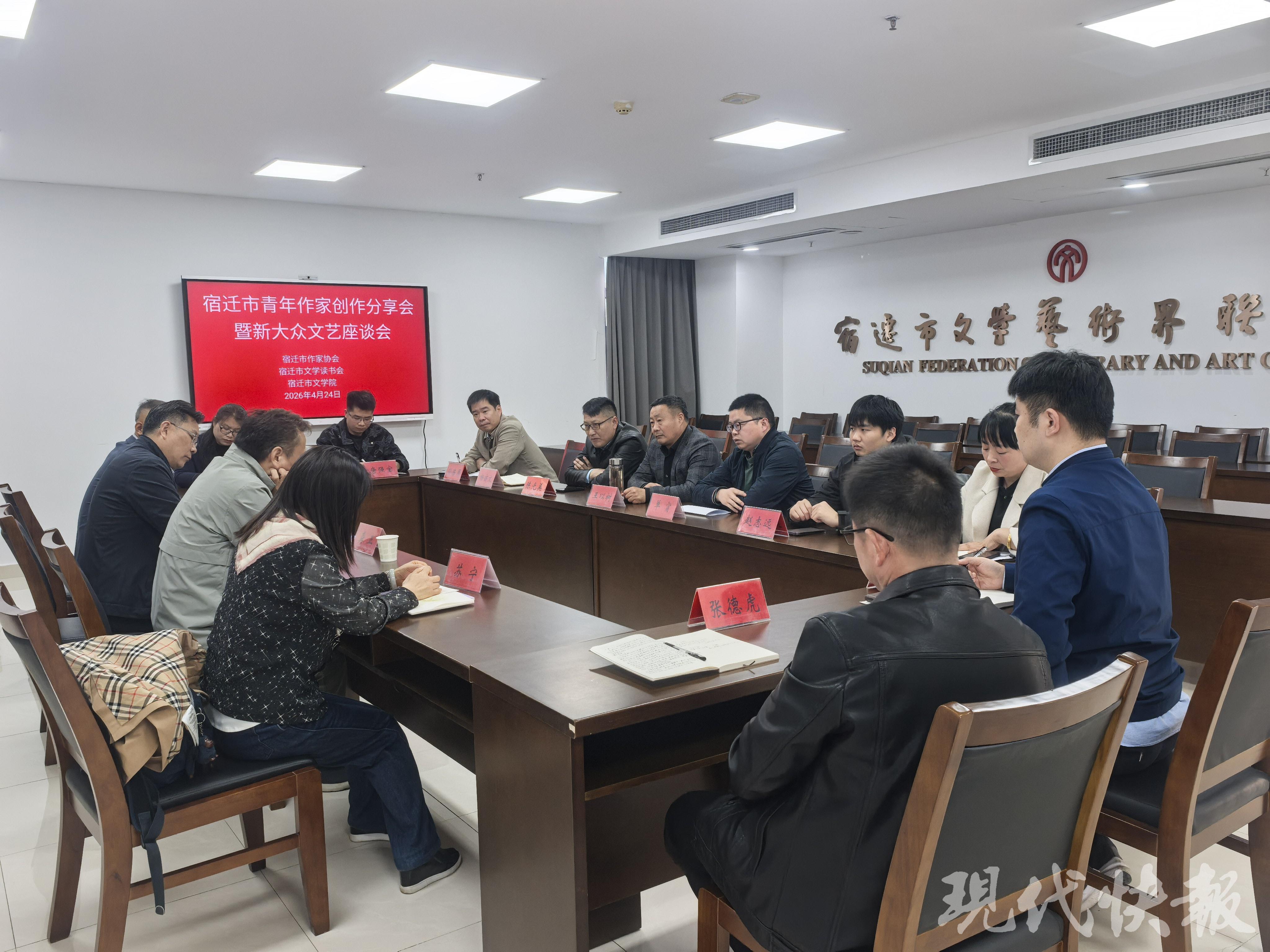4月24日上午,由宿迁市作家协会、市文学读书会、市文学院联合主办的宿迁青年作家创作分享会暨新大众文艺座谈会在市文联举行,近二十位青年作家与新大众文艺创作代表参加。淮安市作协主席龚正、副主席苏宁应邀出席。会议由市文学院副院长、市作协副主席兼秘书长墨中白主持。