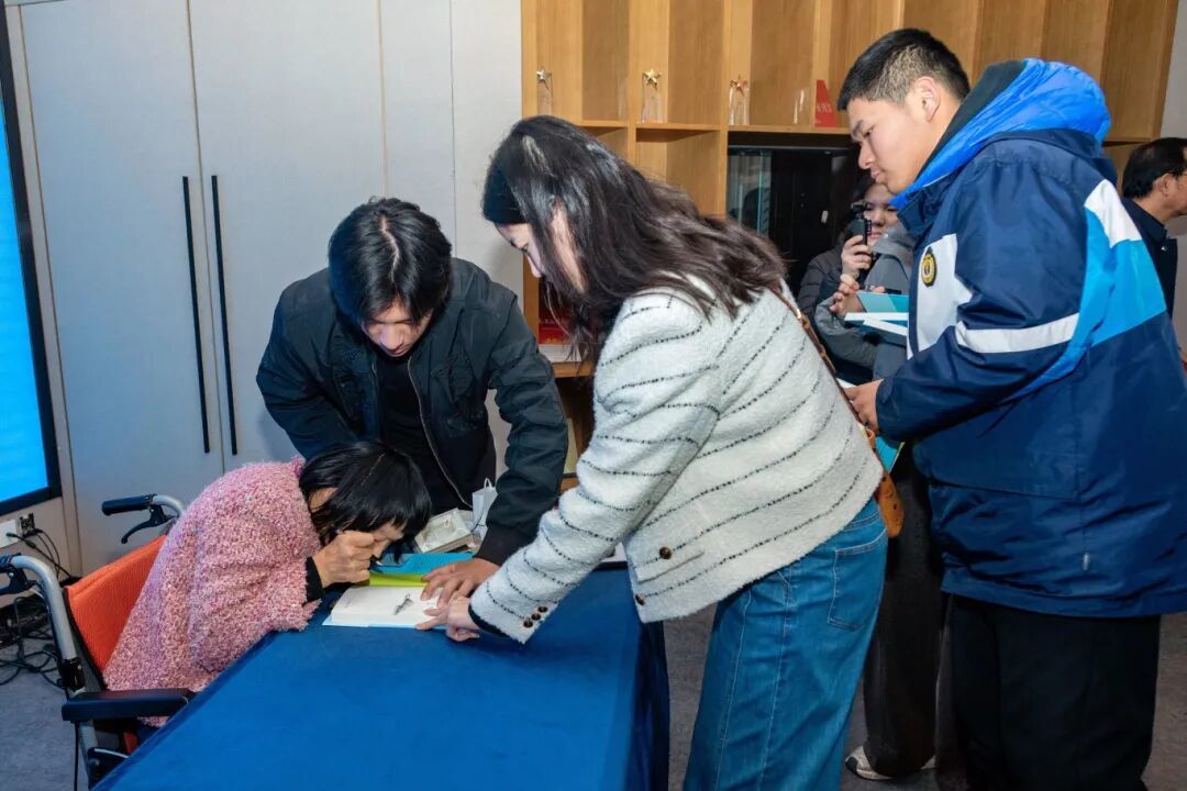“我的动力来自我的喜欢和坚持,一个人只要有热爱和坚持,任何事都可以抵达……”分享会尾声,王忆与读者展开互动。当她一字一字在键盘上艰难地敲击出回应的字符,全场读者屏住了呼吸,目光不断在她的轮椅、电脑屏幕与竭力起落的手指间流转,不少人红了眼眶。一位读者情不自禁地起身,向王忆表达敬意与感动。她动容地说:“您身上的这份坚韧与热忱,让我仿佛看见,史铁生回来了。”