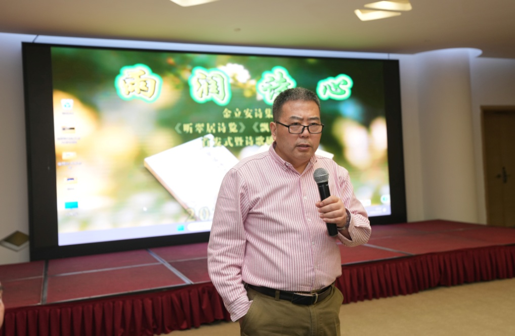 作者金立安在介绍两部诗集的创作历程时,以《铸进血液里的诗魂》为题分享了自身的写作感悟与诗意人生。他表示,自己始终坚持以生活入诗、以情怀落笔,《听翠居诗览》的清雅沉静与《飘雨的日子》的温润动人,皆是其对生活、对时代的真实表达,也是其诗心的具象体现。