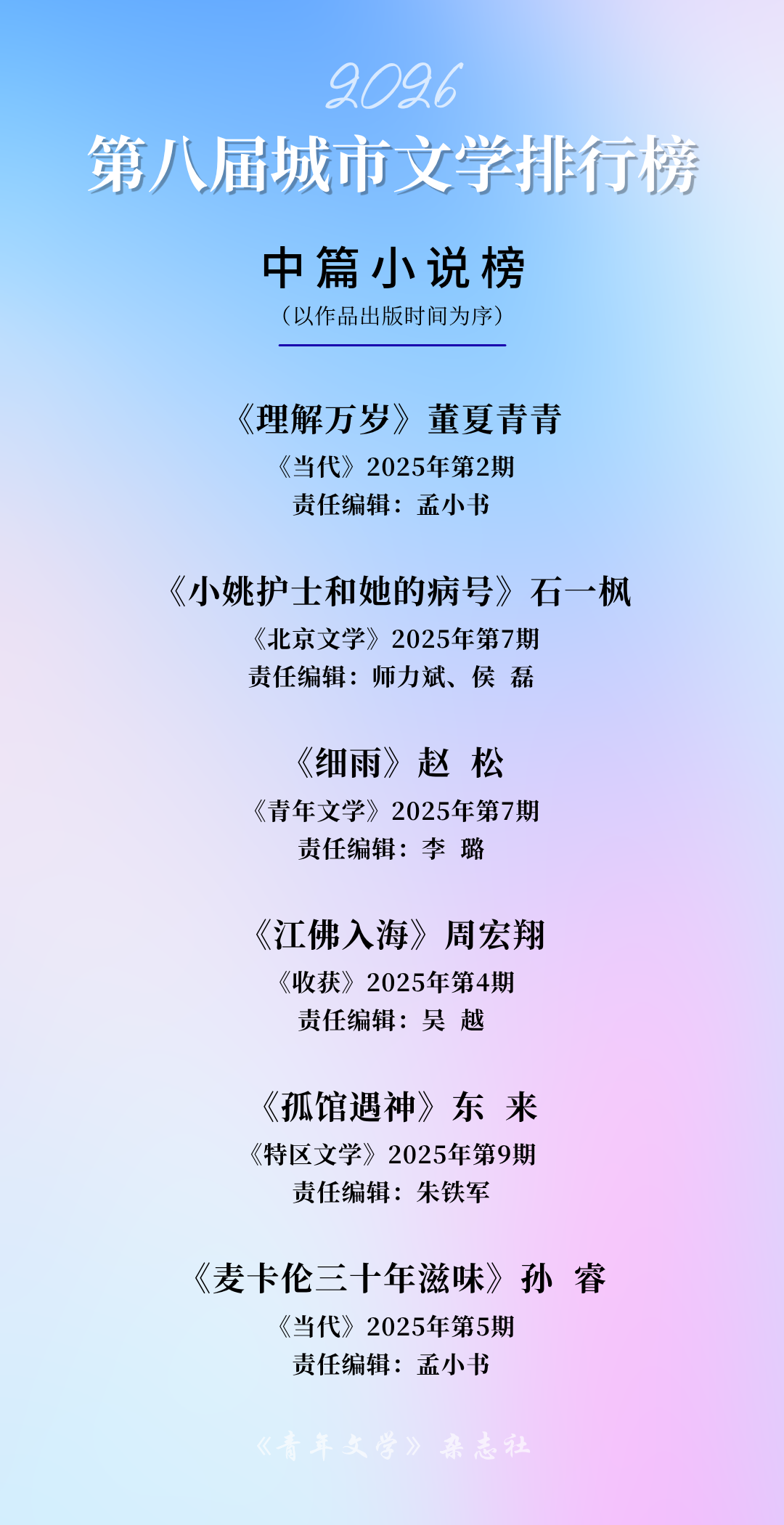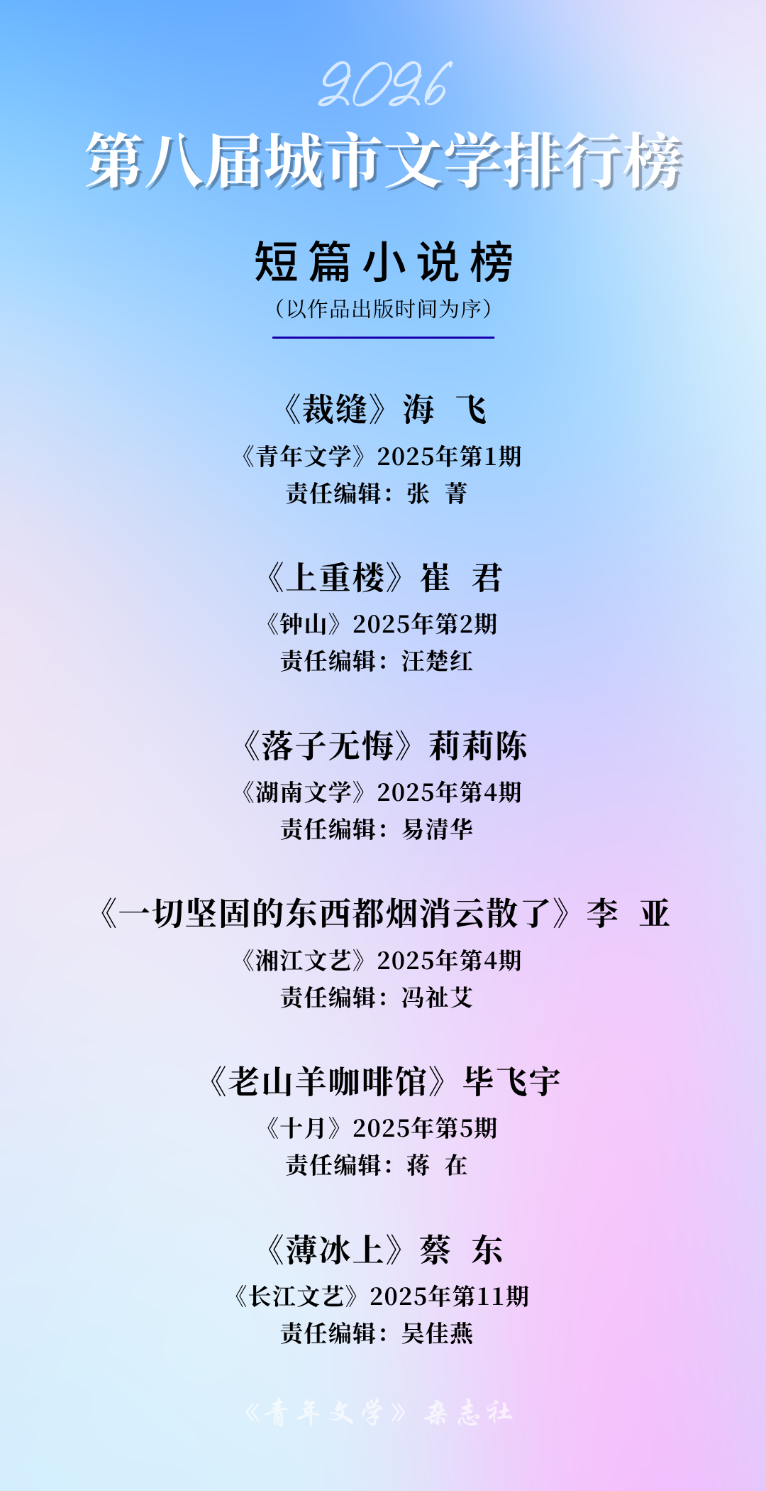 2026年,《青年文学》杂志社发起第八届城市文学排行榜。50家原创文学期刊共计推荐小说作品246篇,包括中篇小说98篇,短篇小说148篇。