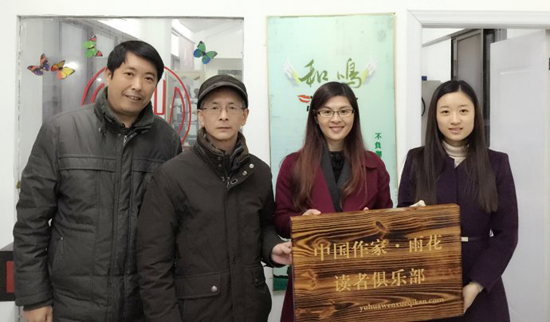 2016的钟声敲响,位于洪泽湖文化广场的“和鸣文艺沙龙”迎来一件“喜大普奔”的好事,和鸣文艺沙龙荣膺“中国作家•雨花读者俱乐部”授牌,挂牌仪式正在筹备之中。省作家协会王朔书记、雨花杂志社主编、中国作家·雨花读者俱乐部副总办事长李风宇亲临和鸣文艺沙龙实地考察,他们深深感动于洪泽湖畔的民间文艺情怀。雨花编辑部主任刘春林,雨花编辑部编辑陈莎莎一行给和鸣送来了这块来自中国作协和雨花携手打造的读者俱乐读的宝贵爱心公益牌。
