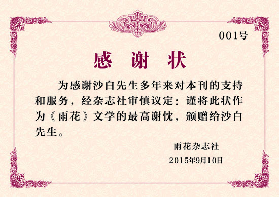 为感谢沙白先生多年来对本刊的支持和服务,经编辑部审慎议定:将本刊第一轴“感谢状”001号,做为《雨花》文学的最高谢忱,颁赠给沙白先生。