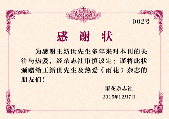 经杂志社审慎议定,谨将本刊第二轴“感谢状”作为《雨花》文学的最高谢忱颁赠给王新世先生以及订阅和阅读《雨花》杂志的朋友们。并在新的一年钟声即将敲响之际送上深深的祝福,因为他们是《雨花》杂志真正的朋友和呵护者!