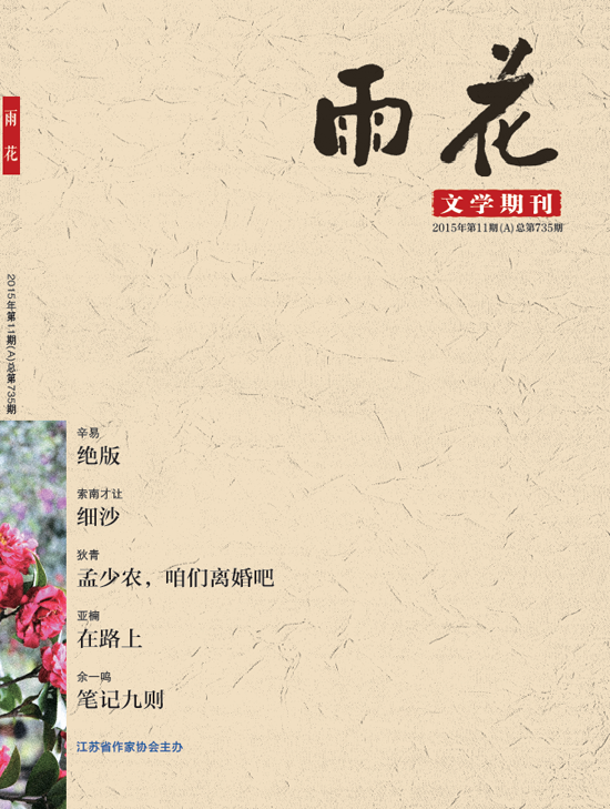 以人民为中心的创作导向作为现今重点强调的文艺作品精神指路标,既给予写作者更明确的创作方向与思路,也给一直以来对人民命运常怀悲悯与关切之心的《雨花》添热打气。2015年,《雨花》从浩瀚来稿中遴选出的16部中篇小说,51部短篇小说,无一不是有血有肉,有泪有笑,有情感,有梦想,有冲突,有挣扎,扎根于人民,反应“人民”于具象的作品。其中一些作品,更是以其光华耀及彼方,比如转载于《小说选刊》的黄跃华的短篇小说《咤叫的乌鸦》、袁炳发的短篇小说《镶牙左》、孙频的中篇小说《丑闻》;转载于《小说月报》的朱山坡的短篇小说《推销员》、海潮的短篇小说《绑架犯和他的女儿》、陈思思的中篇小说《天窗的忧伤》;同时转载于以上两刊的左卫卫的中篇小说《绝版》;以及转载于《长江文艺·好小说》的樊建军的短篇小说《和毛纯一的非虚构》、转载于《小小说选刊》的相裕亭《盐河旧事》之《拥有》,等等,这些作品的选载,既是对其文学价值的肯定,某种程度也算作对当下“讲述中国故事” 万家争鸣的博观而约取。